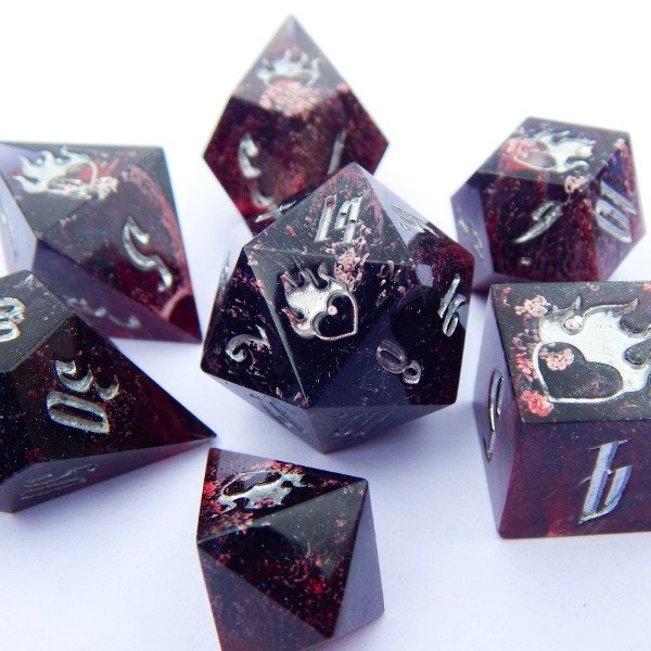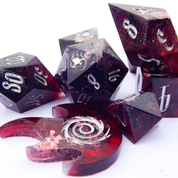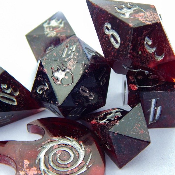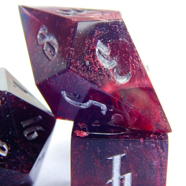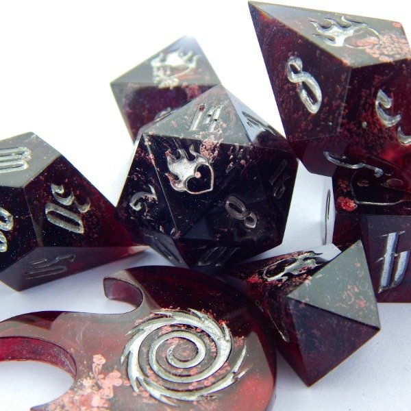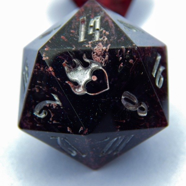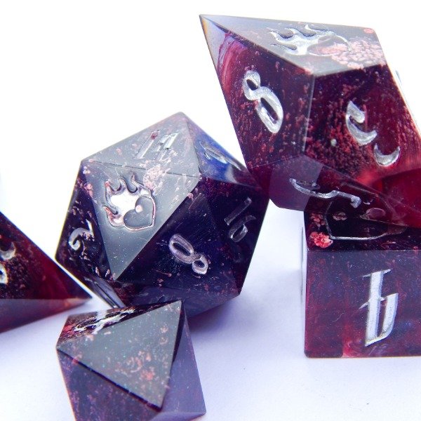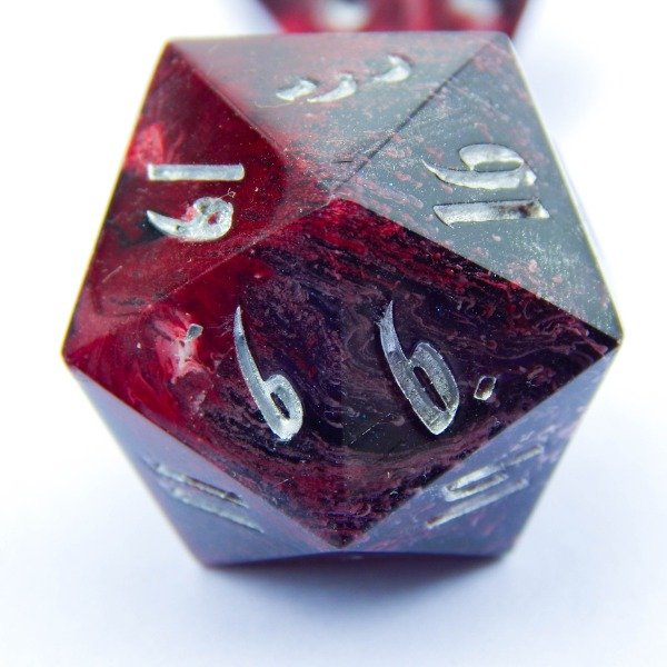 Dados con tecnica Petri Dish en rojo y blanco. Dado en negro traslucido con mica azul. Numeros color plata.