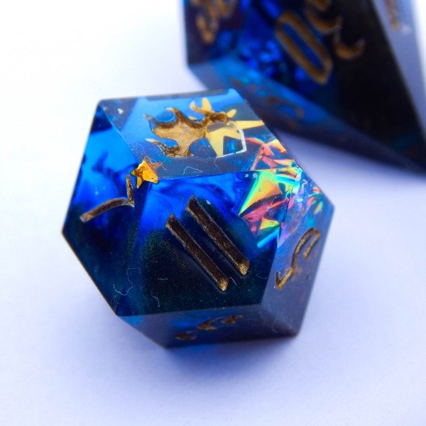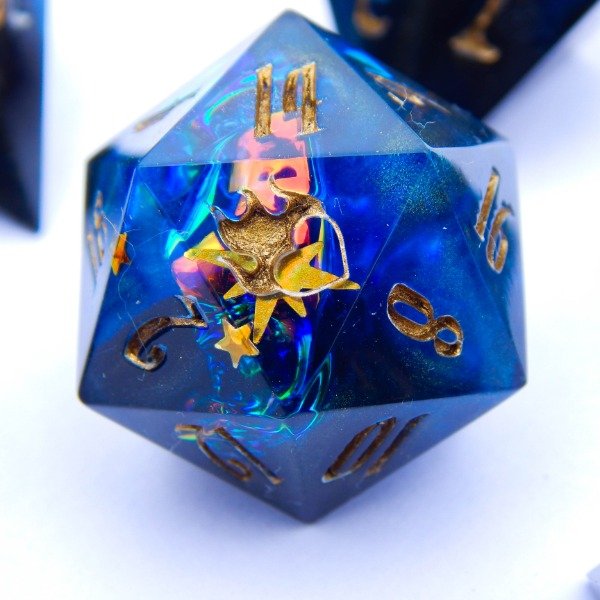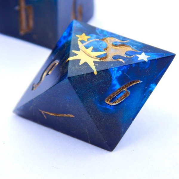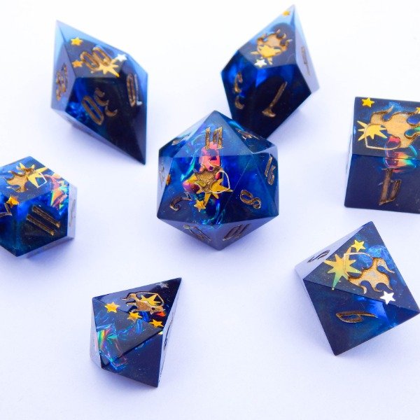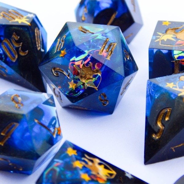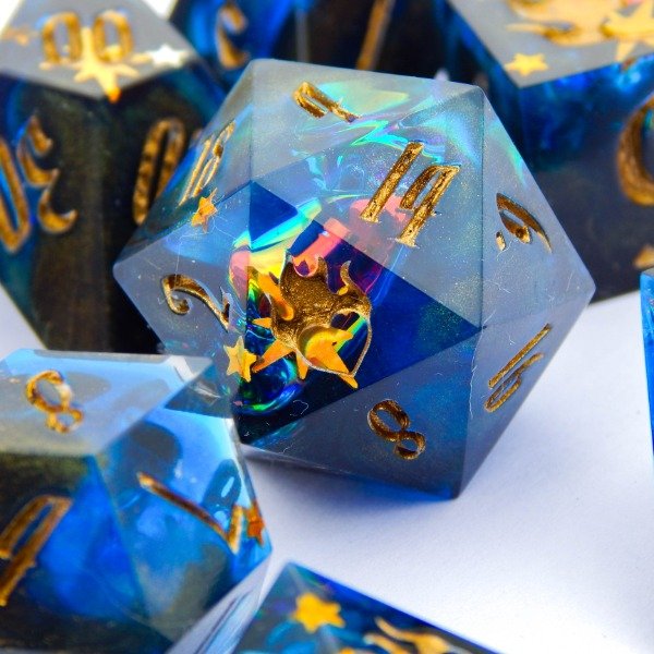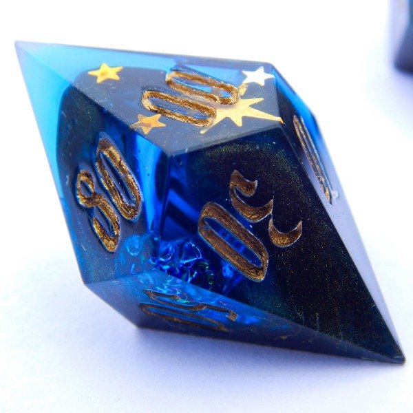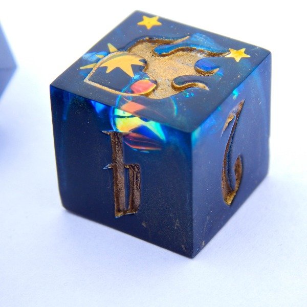 Dados azules traslucidos con nube negro solido y mica dorado. Estrellas es dorado y foil fundido.