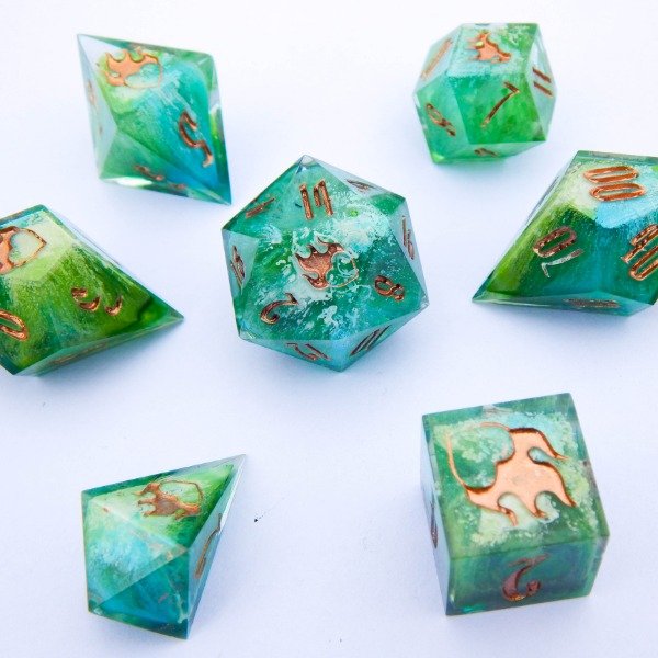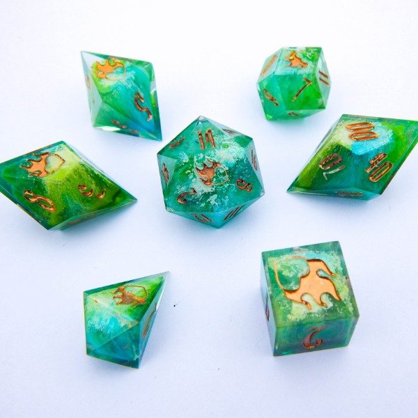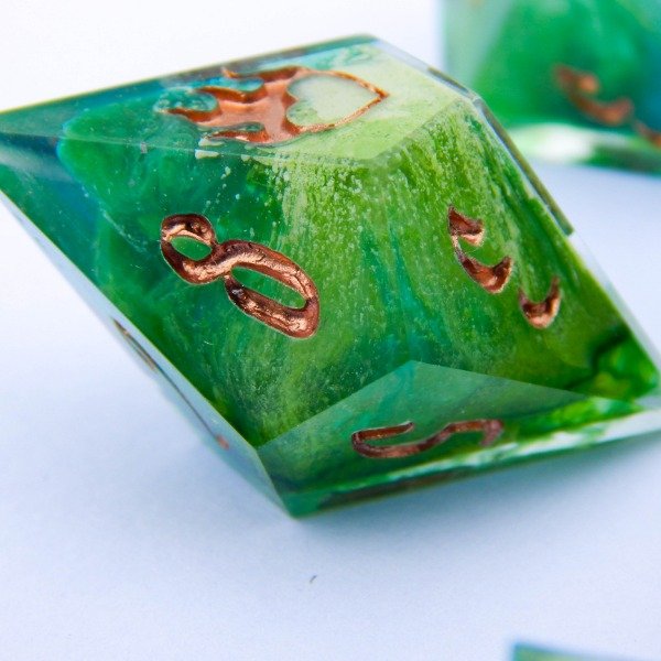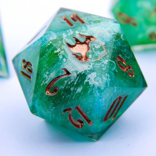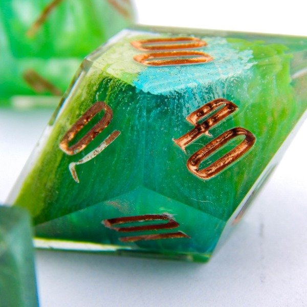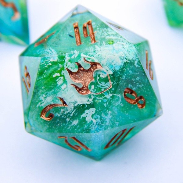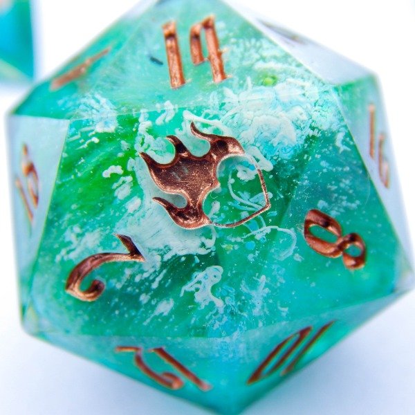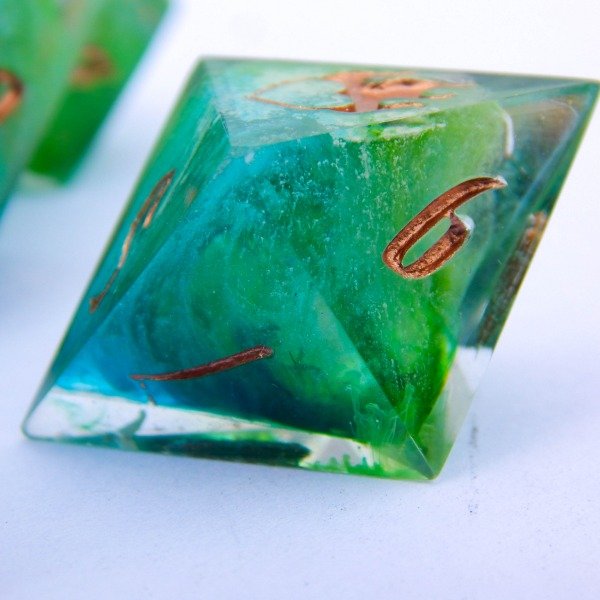 Dados con tecnica Petri Dish en turquesa, verde y blanco encapsulado. Numeros en cobre.